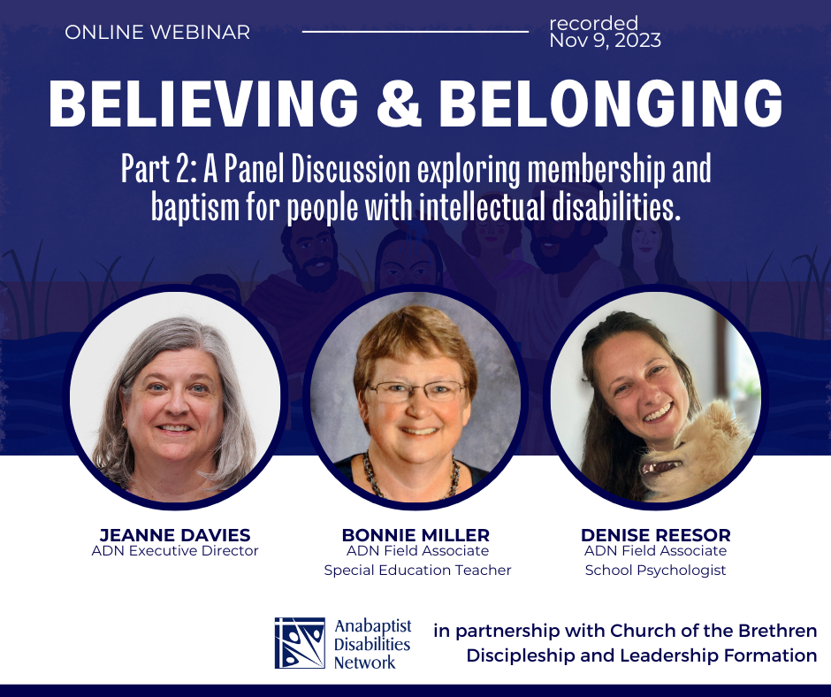 ADN field associates Bonnie Miller and Denise Reesor and executive director Jeanne Davies discuss exploring membership with people who have intellectual disabilities. Topics of discussion include inclusive classrooms and personal study with a pastor, mentor or parent; strategies for engaging and learning; and how to use ADN’s new curriculum Believing and Belonging: An Accessible Anabaptist Membership Curriculum.