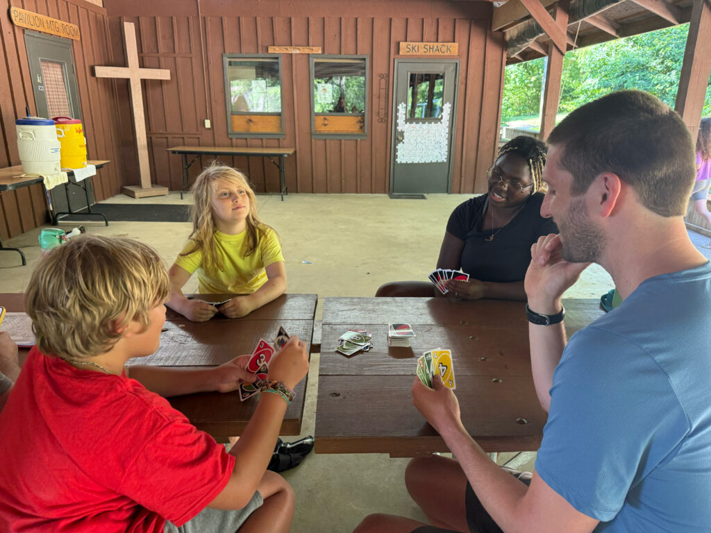 Caption: A neurodivergent camper and his support staff play Uno with other campers and counselors. The rules may have changed mid-game, but the fun levels only increased. Photo credit: Sarah Parcell.